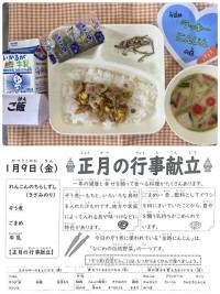 今日から3学期の給食が始まりました!今日の献立 令和8年1月9日(金) ● れんこんのちらしずし ● きざみのり ● ぞう煮 ● ごまめ ● 牛乳 正月の行事献立です。 「れんこんのちらしずし(具)」...