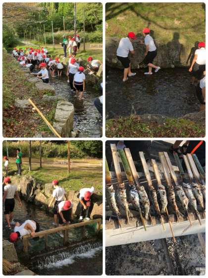 オリエンテーリングの後は魚つかみです。湧き水が近くにあり、きれいな川で魚を捕まえました。魚がその場で宿舎の方に焼いてもらいました。