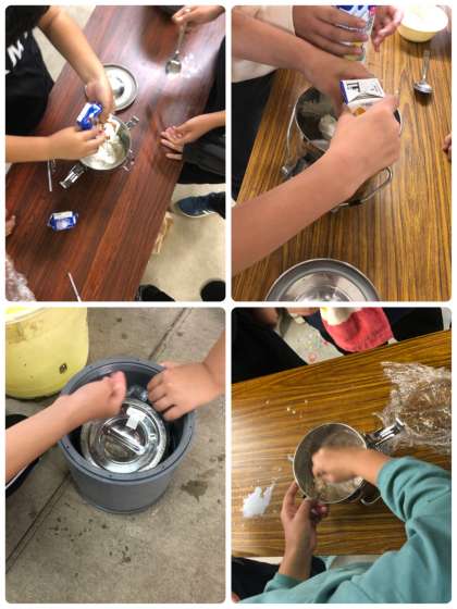 活動班でアイスクリーム作りにチャレンジしました。材料を入れた容器の周りに氷と塩を入れて30分間、班で協力しながら転がします。転がした後に容器を開けるとアイスクリームができていました。