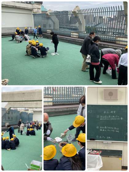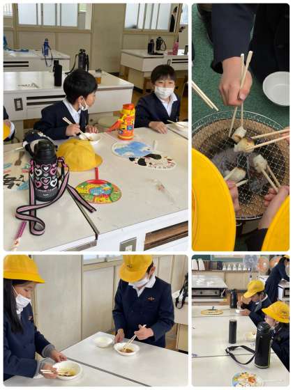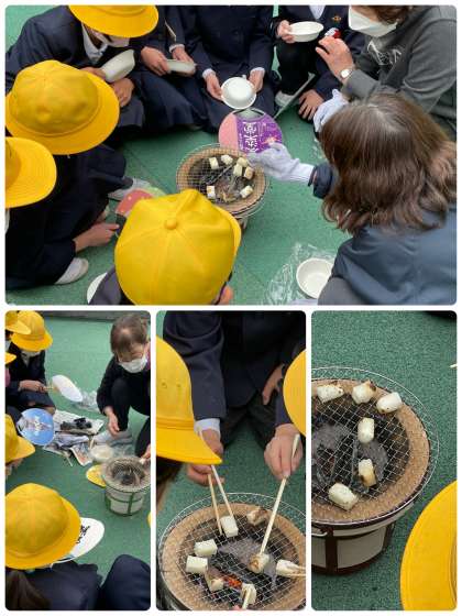 3年生の子ども達は、地域の天寿会の皆様をゲストティーチャーとしてお招きして、七輪体験を行いました。七輪に木材や木炭を置き、団扇であおぎながら火をつけるところから、餅を焼くところまで丁寧に教えていただきました。餅を焼く際の焼き加減が難しく、焦げないように七輪の上で何度も餅を返して焼いていました。内側からぷっくり膨らんだ餅はとても美味しく、子ども達はみんな笑顔で餅を頬張っていました。