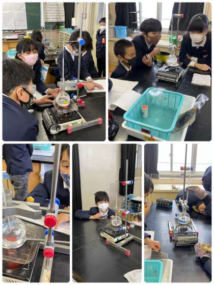 4年生の理科では、水を熱した時の変化について、実験しました。最初はフラスコ内がくもるだけの小さな変化でしたが、水の温度が高くなるにつれて、大きな泡が出てくるようになり、子ども達はびっくりしていました。中には100度近くになると温度が上がらなくなることに気づいた子やフラスコ内の水の量が減っていることに気づいた子もいました。実験をとおしていろんな気づきをもつことができて、とても素晴らしいです。