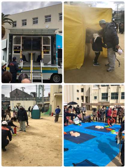 大規模災害が起きた時に冷静な判断ができるように煙中体験や起震車での地震体験、応急処置体験等を行いました。また、避難所開設のDVDの視聴や地震への備えについて学びました。