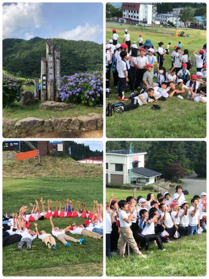 モニュメントの前で学級写真を撮った後、学級や活動班で草原を転がったり、鬼遊びをしたりと思いっきり楽しみました。草原も草刈りがしてありふわふわでした。涼しい風も吹いていて気持ちよく活動できました。