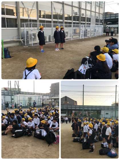 1泊2日の旅を終え、学校に帰ってきました。保護者の方や教職員に出迎えていただきました。児童代表が修学旅行の報告をしました。