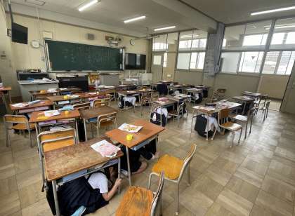 今回は地震を想定しましたが、子どもたちは、先生の話をしっかり聞いて、自分の身を守る行動ができて、素晴らしかったです。