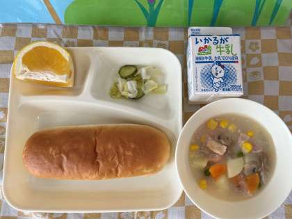 今日の「鶏肉とコーンのシチュー」は、新食品の「シチュールウの素」を使っています。小麦粉や牛乳・乳製品が入っていないため、小麦アレルギー、乳アレルギーのある人も食べることができます。