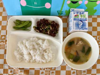 給食では、牛肉とピーマン、たけのこをいため、さとうやしょうゆ、オイスターソースんどで味つけしています。