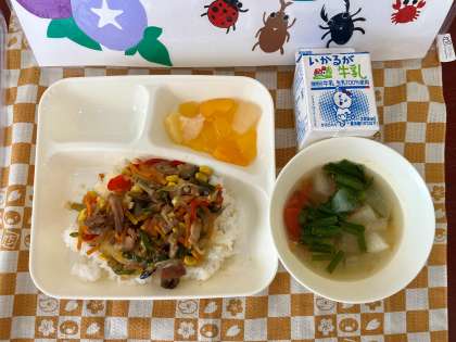 夏祭りのだんじりを盛り上げるために、給食で夏野菜をたくさん食べて体力をつけることができるように工夫しました。お祭り気分を味わえるように、彩りも考えました。