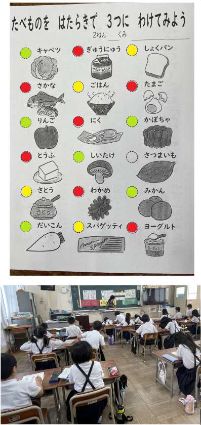 食べ物は、はたらきによって三色食品群に分類できることを、ワークシートの色ぬりを通して知りました。
