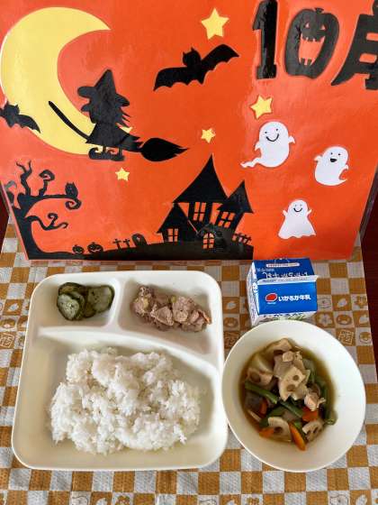 今日の給食では、さといも、れんこん、しめじを使っています。