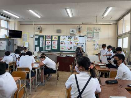 大阪の食文化についての紙芝居を見せてもらった後、大阪の食文化、なにわの伝統野菜、学校給食の3つのジャンルから、班ごとに順番に問題を選び、クイズにチャレンジしました。