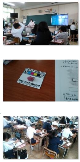 授業では実際に咀嚼力を調べるガムを噛み、噛む回数と唾液が虫歯の抑制と健康維持・向上につながることを学びました。