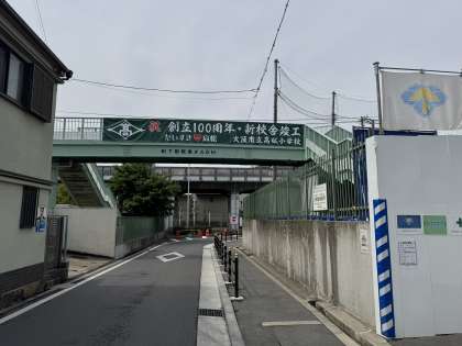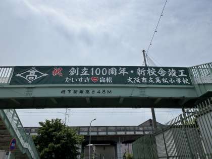 5月1日(木)に「100周年実行委員会」より、寄贈いただいた横断幕を歩道橋に設置いたしました。通学路や校舎からも見ることができ、100周年の機運が高まります。