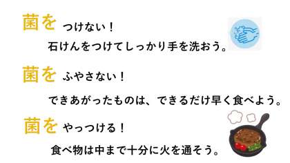 食中毒とは、食べ物に付いている細菌などが原因でかかる病気です。次の3つのポイントに気を付けましょう。