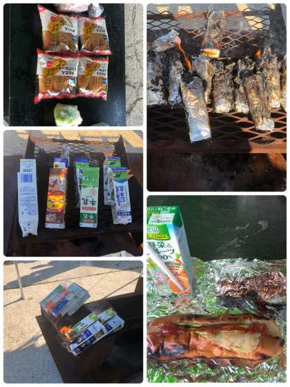 具材を挟んだパンをアルミホイルで包み、紙パックに入れて焼きます。子どもたちは初めての調理法に興味津々でした。できあがったホットドッグもおいしくいただきました。