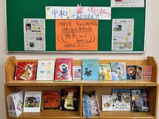 図書室の掲示板コーナーを新しくしています。今年は、終戦80年を迎えた年でもありますので、平和について考える本を集めてみました。