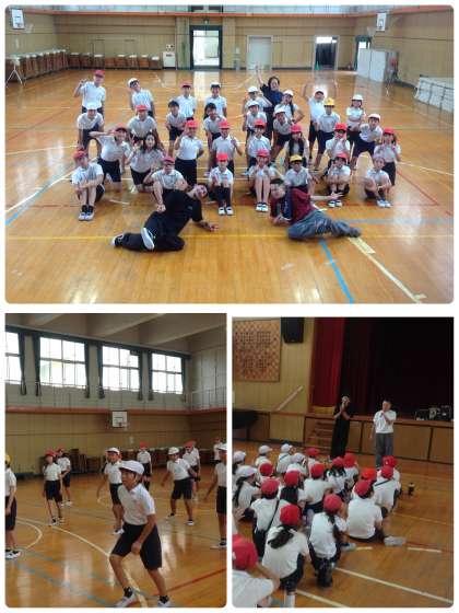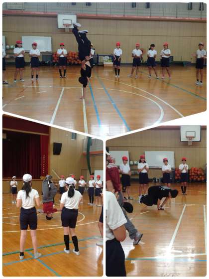 外部講師として、有名アーティストのバックダンサーも務めた経験のあるプロのブレイクダンサーKAKUさんとワンさんを招き、トップアスリートの演技の凄さやダンスの楽しさを味わいました。