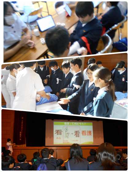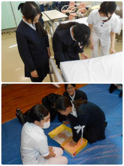 11月19日(水)、キャリア教育の一環で「大阪警察病院看護専門学校」に行き、看護師体験をしました。「心臓マッサージ体験」「あかちゃん抱っこ体験」「正しい包帯の巻き方体験」「ベッドのシート交換体験」「聴診器の利用による血圧測定、脈拍測定体験」をしました。