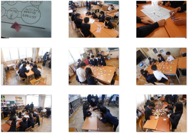 集会では、運営委員会が作成した 「すごろく」 と、各学級で考えたオリジナルカルタを使った 「 お正月あそび 」 に取り組みました。