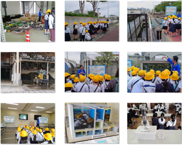 続いて、クラスごとに施設内を見学しました。災害時に活躍する給水車を見たり、淀川の水が硫酸バンドやオゾン、砂などを使ってきれいになっていく様子を確かめたりしました。また、においや汚れを分解するオゾン水の実験も見学しました。色のついた水が透明に変わる様子に、子どもたちからは「わあ」「すごい」といった声が上がり、興味深く見入っていました。