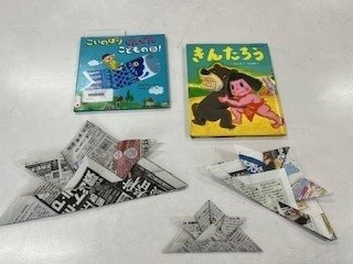 図書室では、5月5日のこどもの日にちなんで新聞折り紙をしました。