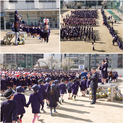 2〜6年生が拍手で迎える中、となりの子と手をつないで入場してきた1年生。今年の1年生は220名で、6クラスあります。
