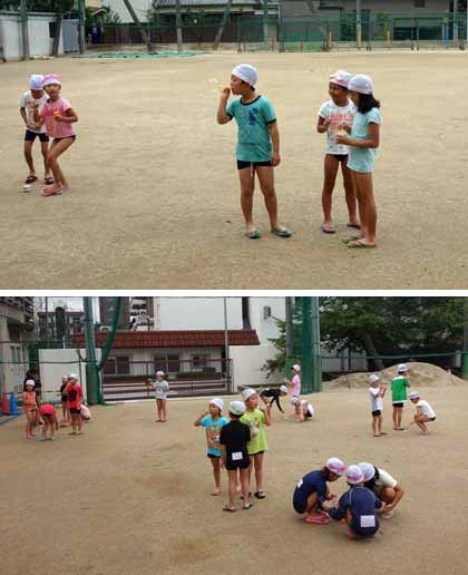 シャボン玉遊びチームは、なかよし学級前あたりで。やっているうちに適度な息の強さをつかんで、パパパパ〜ッと連続発射成功! 大小美しいシャボン玉が宙を舞っていました。中には、シャボン液に吹き具を入れた状態で息を吹きかけて“シャボン玉アフロ”をつくっている子も。(笑)