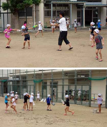 1時間目、運動場で水遊び&シャボン玉遊びをしました。雨が降っていたら中止だったのですが、みんなの思いが通じたのか、なんとか曇り空をキープ!