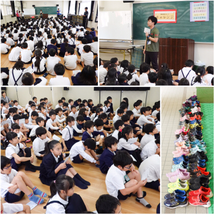 3時間目、多目的室前にたくさんの靴が。学年集会で集まった3年生の靴です。きれいに並べられていました。