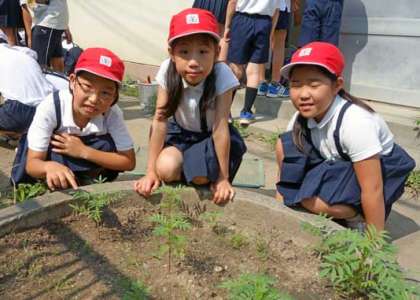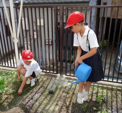 1時間目、子どもたちが分校の学習園で、ホウセンカとマリーゴールドの植え替え(定植)作業をしていました。