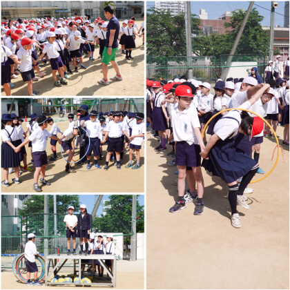 集会委員会の児童が考えたゲームは、「輪くぐり」です。となりどうし手をつないだ状態で輪くぐりをしていき、最後の子がくぐったらゴールです。