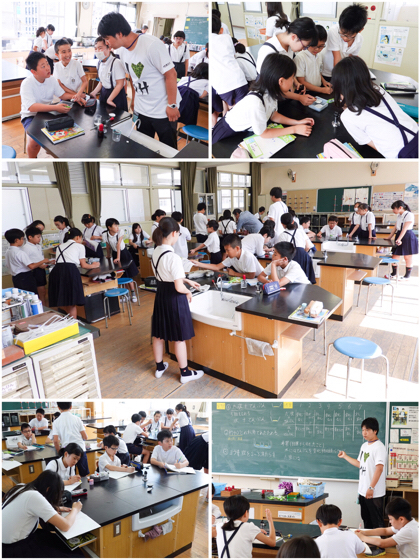 1時間目、理科室で実験をする5組の子どもたち。でんぷんとヨウ素液を使って、だ液のはたらきを調べていました。