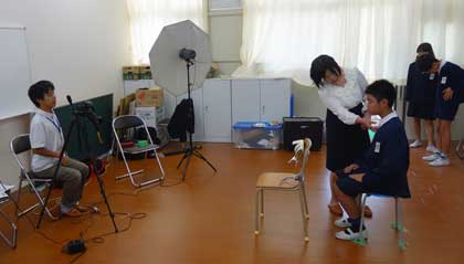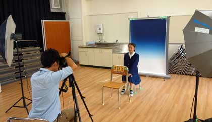 多目的室と小会議室を使って、卒業アルバム用の個人写真撮影が行われました。カメラマンさん2人が、専用の機材を持ち込んでスタンバイ!