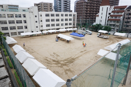 前日の今日(7日)、午後4時過ぎからテント張りや資材・物品の搬入作業がスタート。運動場には水たまりがたくさん残っている状態でしたが、短時間でたくさんのテントが立ちました。
