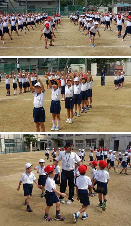 1年生は、1時間目講堂で練習し、3時間目は運動場で練習していました。団体演技(ダンス)の練習です。