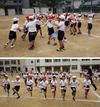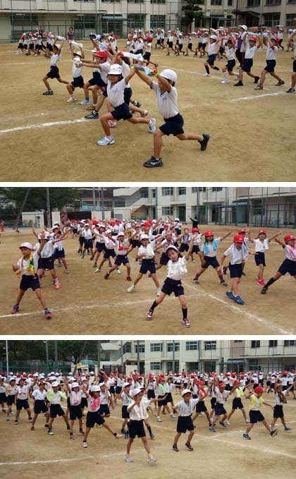 2時間目、運動場での練習。タオルを使ったダンスです。