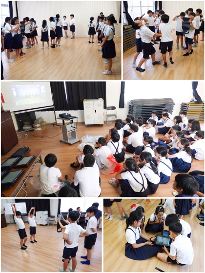 3組は、多目的室で、キャンプファイヤーの出し物の練習。自分たちの動きやトークのチェックをするために、タブレットの動画撮影機能を活用していました。