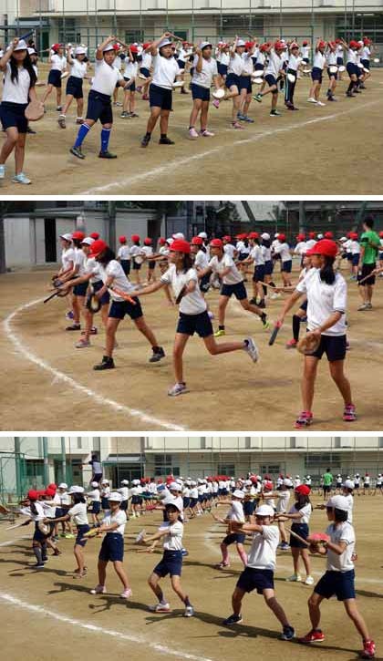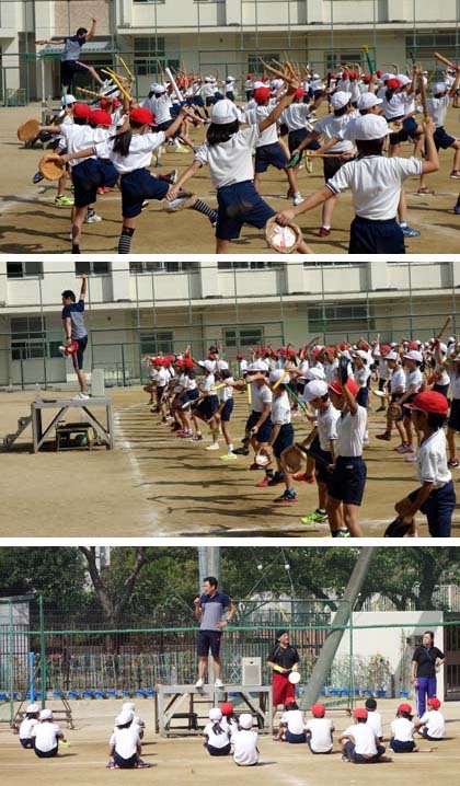 2時間目、運動場でエイサーの練習。手作りパーランクの“ドンドン”という音が心地よく響いていました。隊形移動や踊る向きも確認していました。