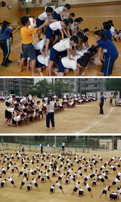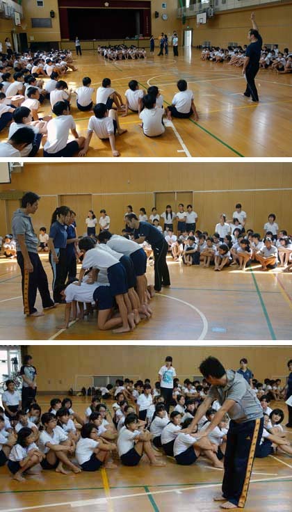 講堂では巨大ピラミッドの練習。場所や並び方、かけ声の確認をし、組み立てるとき・崩す時の注意やアドバイスなどを聞きました。1回目の練習ということで、上るときの感覚をつかんだり、土台にどれくらいの負荷がかかるのかを体感したりすることに重点を置いているように感じました。