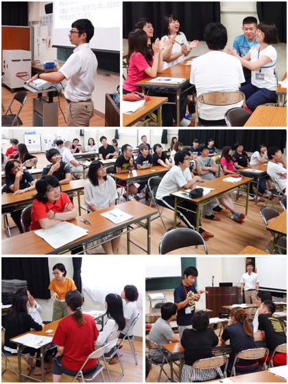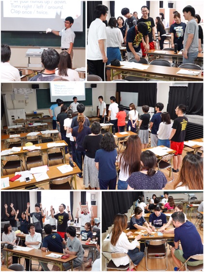 後半は、「授業で使う英語での指示、会話、アクティビティ」を教わりました。Let's try Activity!ということで、先生役・児童役になって実際にやってみました。英語で指示を出す、指示どおりやる、交代してやる。一生懸命だからこそのファインプレーや珍プレー続出で、拍手や笑いがたくさん起こっていました。