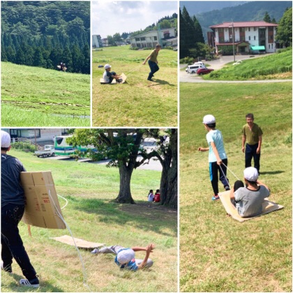 すべって転ぶのも気持ちいい!(ダンボールそりは、用法を守って正しくお使いください)