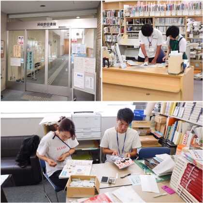 阿倍野図書館で仕事をする3人の先生方。2年3組担任のK先生、4年2組担任のH先生、5年5組担任のH先生の3人が、8月5日,6日の2日間、阿倍野図書館で社会体験研修をさせていただきました。
