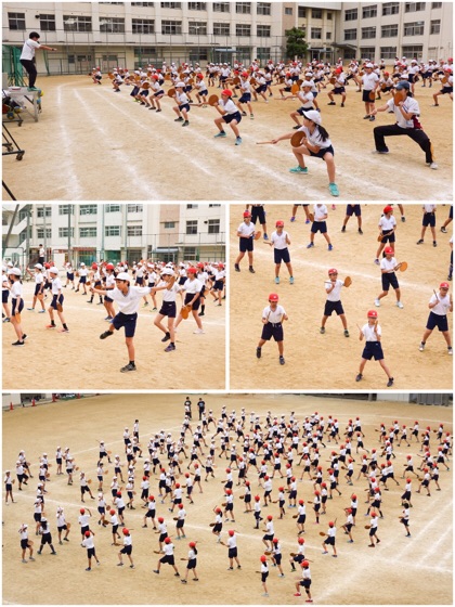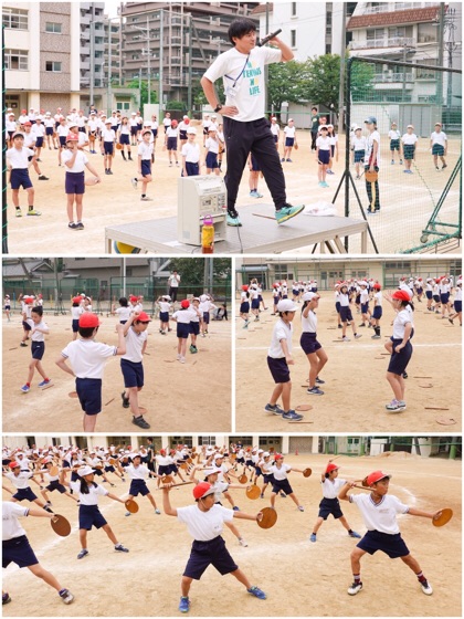 中心になって指導しているのは、5組担任のH先生。マイク片手に、見本を見せながらの指導。力が入っていました。