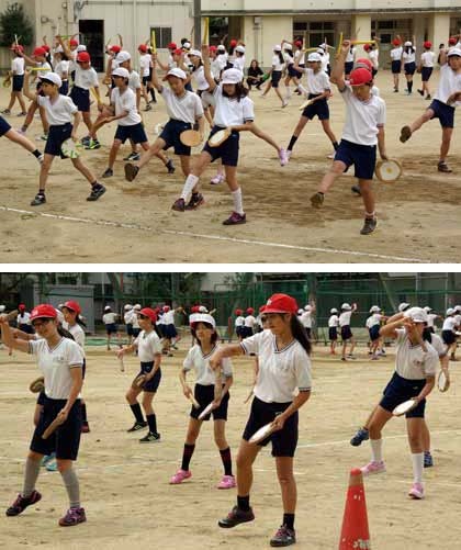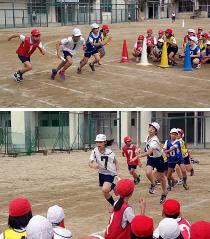 5年生は、授業時間にエイサーの練習、パワーアップタイムに赤白対抗リレーの練習をしていました。