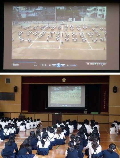 2時間目、講堂で組体操のビデオ上映会が行われていました。もちろん自分たちの演技。先週の金曜日に南校舎から撮影したものです。