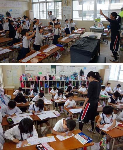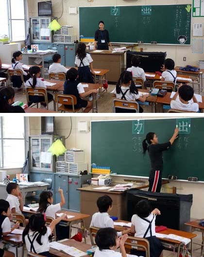 5時間目、教育実習生のK先生が国語の授業をしていました。新出漢字の学習です。今日の漢字は「出」と「力」です。