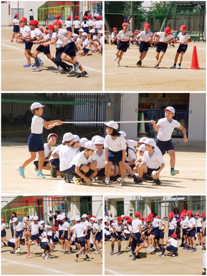 2時間目、団体競技「台風の目」の練習をする4年生です。