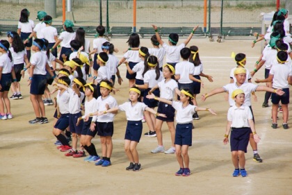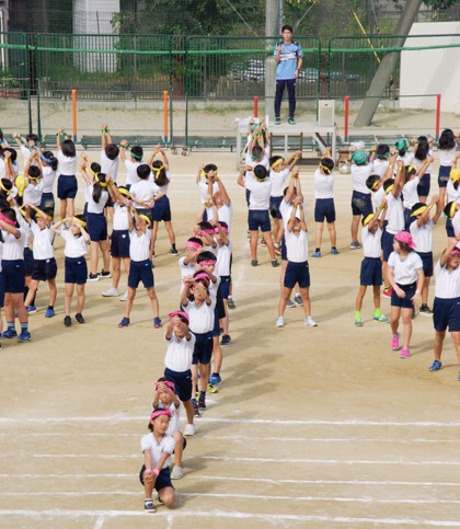 1時間目、団体演技(ダンス)の練習をする4年生です。
