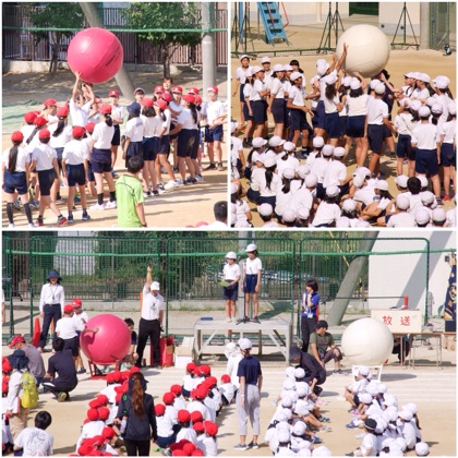 1時間目、運動会の全体練習が行われました。今日は、入場行進〜開会式〜準備体操と、全校競技の大玉おくり「つなごう ときわの輪」の練習でした。