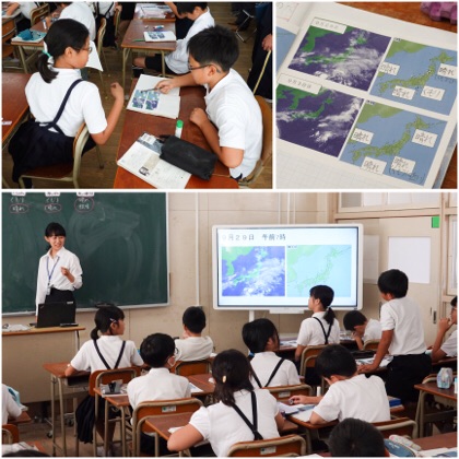 9月29日、30日の実際のアメダスの降水量情報と気象衛星による雲画像が用意されていました。それらを見ながら、福岡・大阪・東京・北海道の天気を予想し、実際の天気を確認していました。